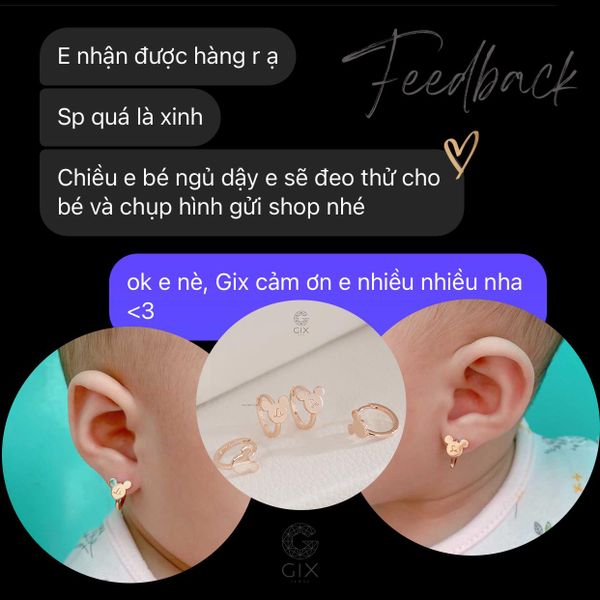 "Mình biết đến Gix do trải nghiệm đủ sản phẩm từ lắc, bông tai đến nhẫn cưới luôn nên mình tin tưởng và gửi gắm Gix vào mẫu bông tai vàng cho bé nhà mình lắm. Da bé khá nhạy cảm nhưng đeo sản phẩm của Gix không hề dị ứng, nổi mẩn đỏ gì cả, rất chất lượng nha, xứng đáng đồng tiền bỏ ra lắm."