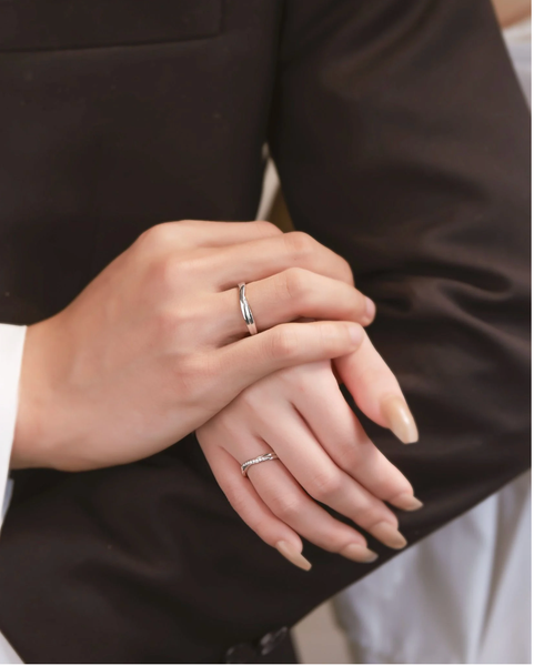 Kiểu dáng: Nhẫn tròn bản vừa, nhẫn nữ đính đá toàn vòng (eternity style) lấp lánh, nhẫn nam tối giản hơn nhưng vẫn có điểm nhấn bằng đá bên trong mang đến cảm giác đồng điệu và hiện đại.